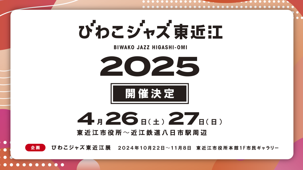 滋賀県東近江市にて毎年おこなわれている「びわこジャズ東近江」、本年2025年は4月26日(土)27日(日)に開催されます。コロナ禍でライブ活動を自粛していましたが、2019年以来6年ぶりに出演いたします。