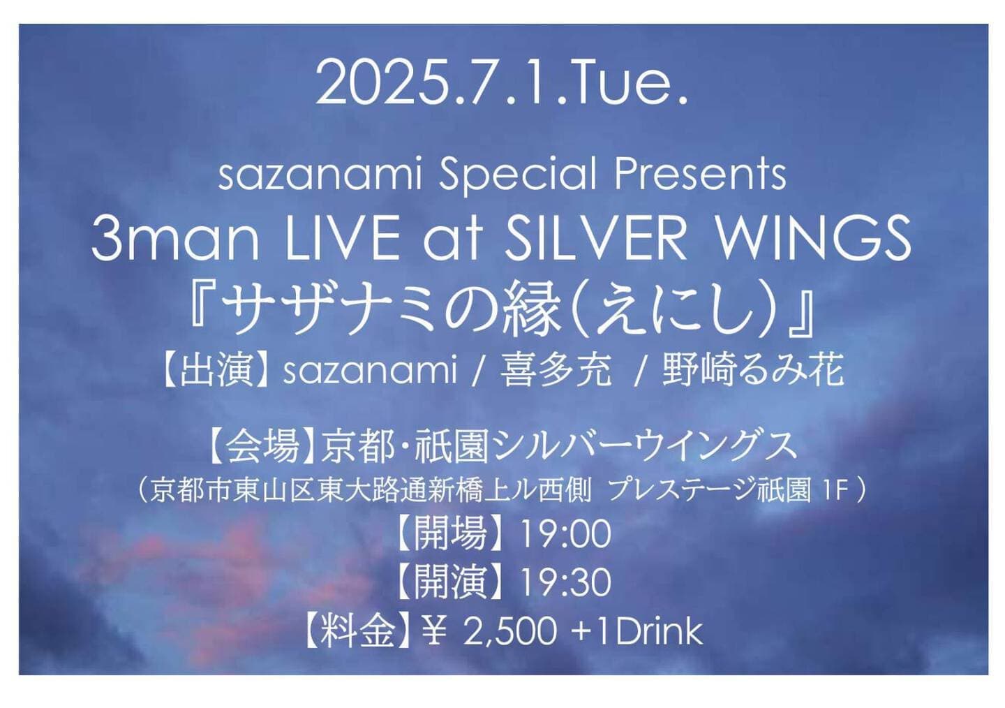 ▶︎[LIVE] 7/1(火)喜多充、京都祇園「シルバーウイングス」にて開催されるスリーマンライブ「サザナミの縁(えにし)」、無事終了しました。
