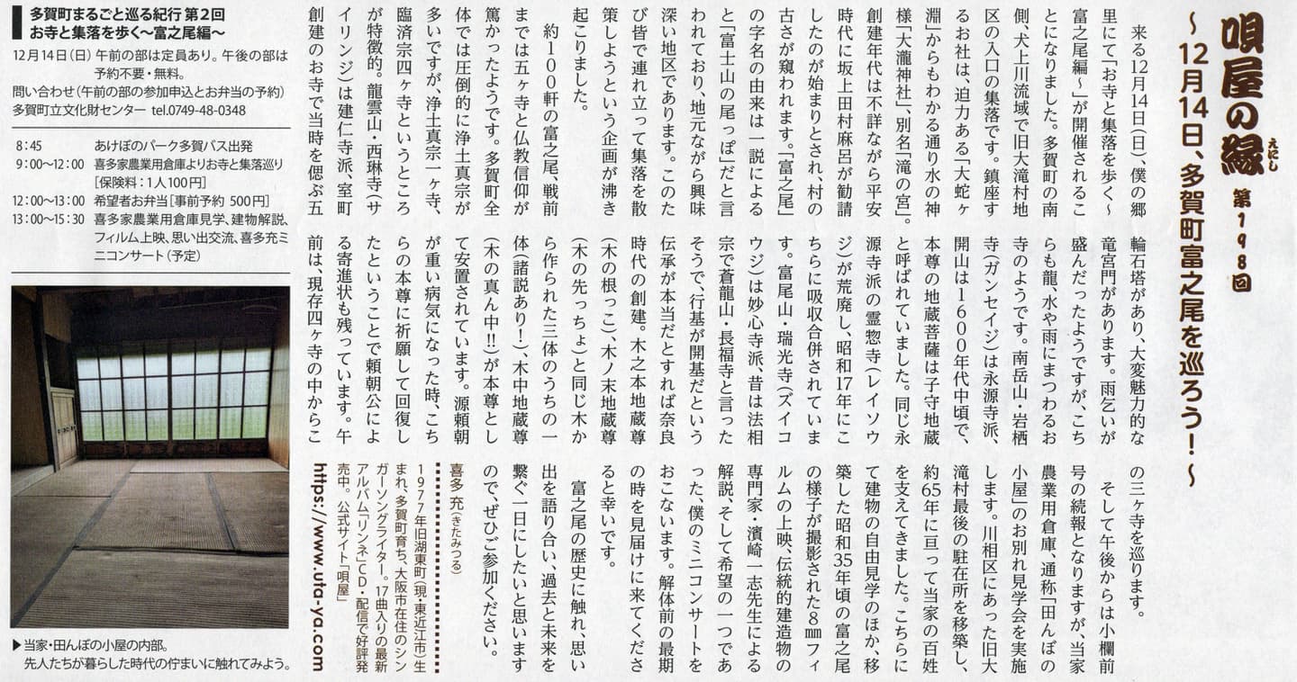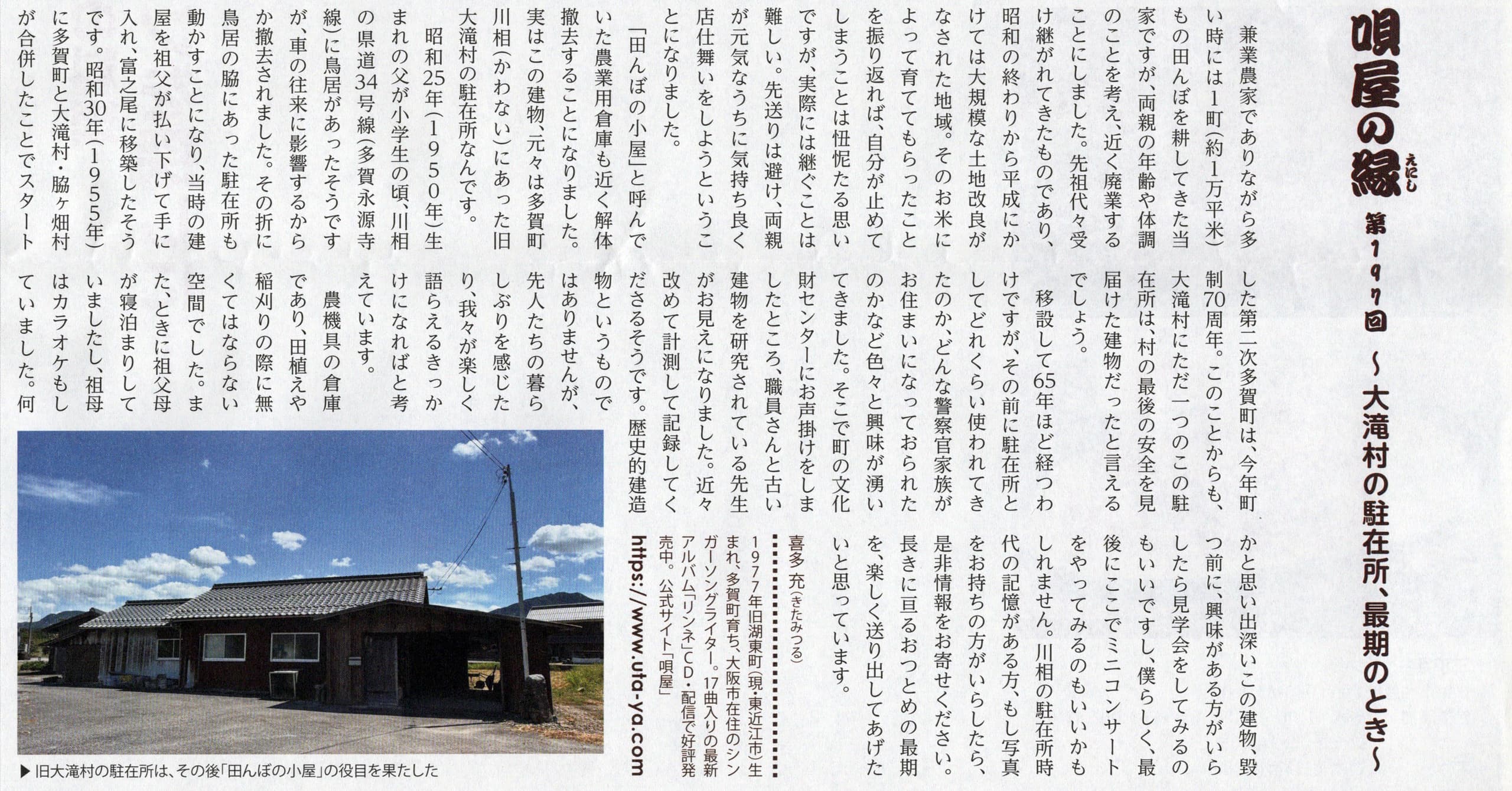 滋賀県湖東湖北地域で発行されている「DADA Journal」(読売新聞の折込を中心に配布)に掲載中のコラム「唄屋の縁」は、2004年10月の第1回掲載から連載20周年を迎えました。日頃の皆様のご愛読に感謝しております。これまで執筆してまいりましたタイトルと内容をリストにしました。今後ともどうぞよろしくお願いいたします。